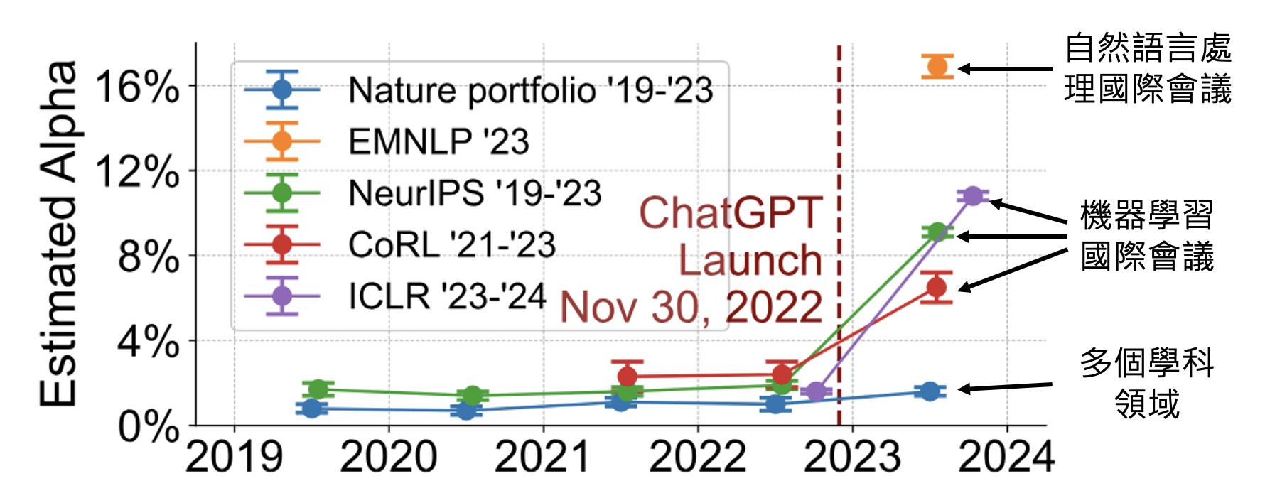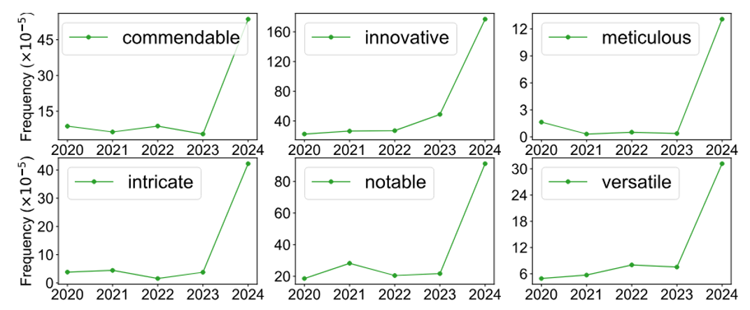 现在的语言模型会被用在任何地方,甚至 AI 顶会论文的审查意见都有 AI 撰写的可能。有研究发现,自 ChatGPT 发布以来,AI 顶会审查意见的 AI 使用率有所提升,但传统自然科学领域的 AI 使用率不高。