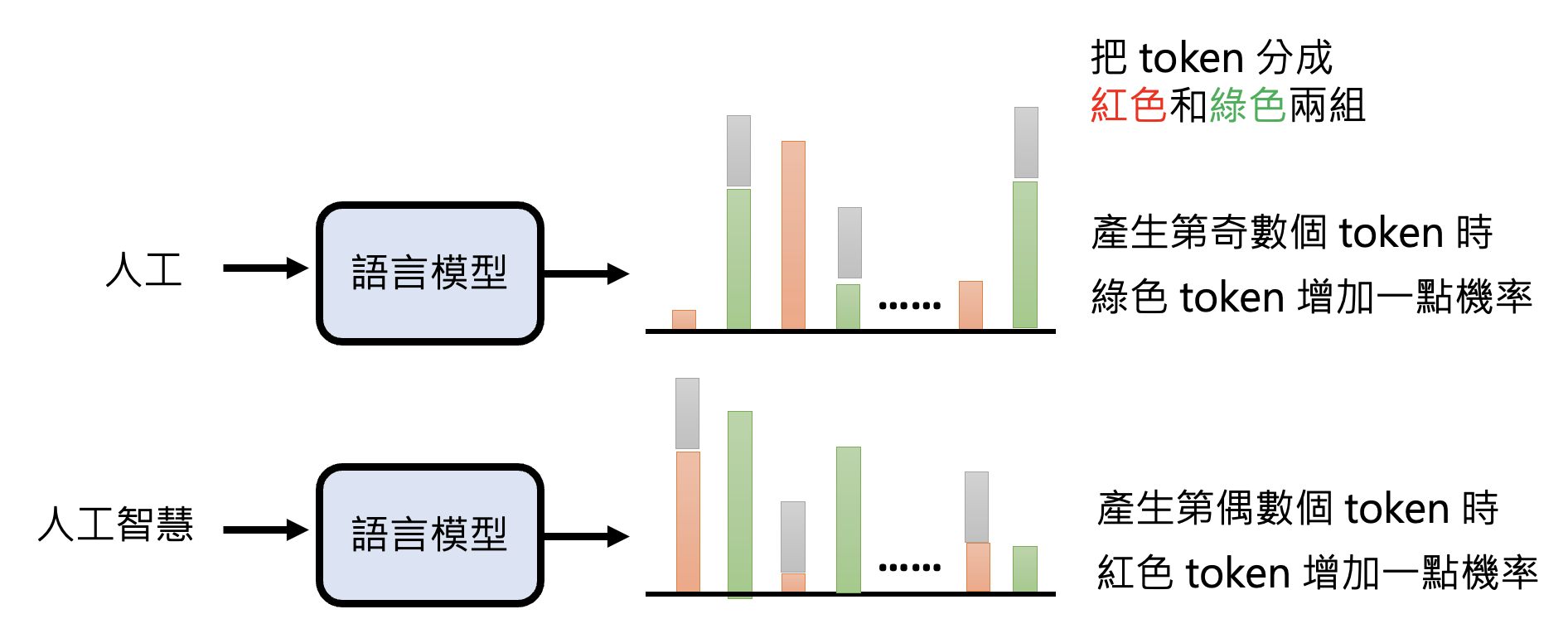 语言模型可以为自己的输出加上水印(人类难以辨认的“暗号”,经过特定的检测器后就能发现是语言模型生成的文本。下面给出简化后的一种加水印的方法:
