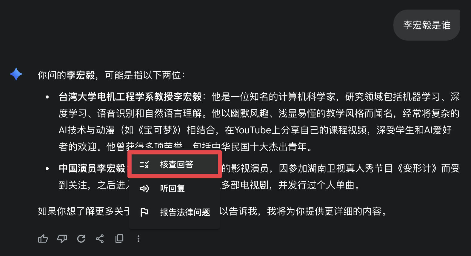 Gemini 有一个事实核查的功能(在 2025/08/09,这个功能叫做“核查回答”。在 Gemini 给出答案后,如果用户不太相信的话,可以点一下这个按钮,它就会检查答案的真实性。