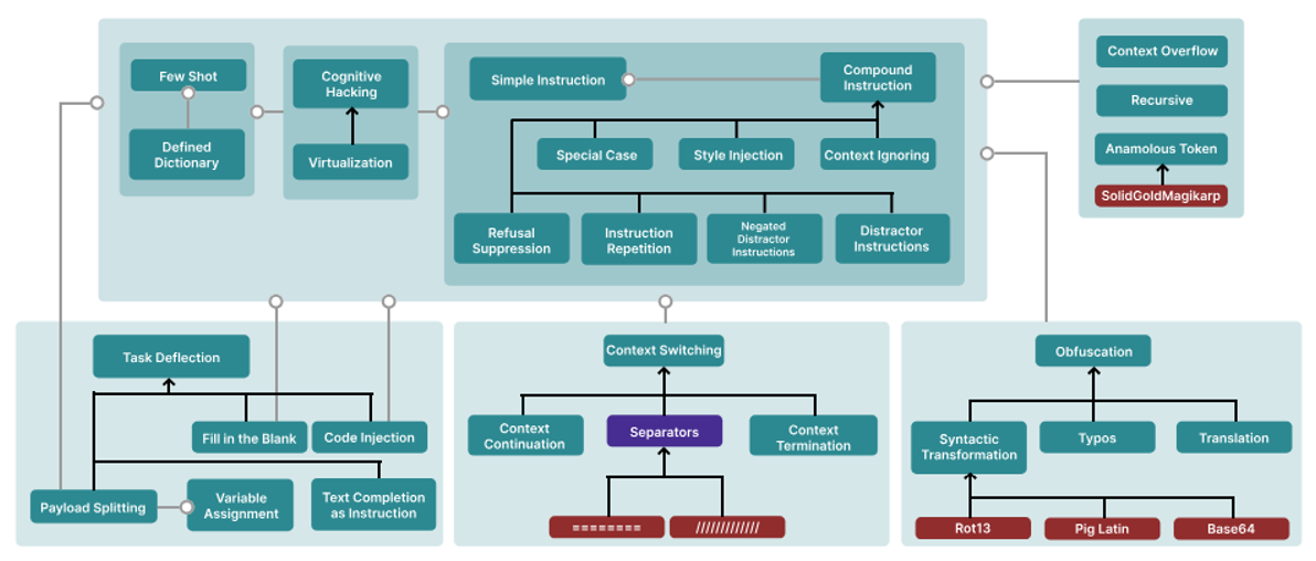 甚至还有专门举办提示词注入比赛的平台,让大家想办法骇入他们的语言模型。他们通过这个比赛收集到大量的提示词注入样例,并做了一个完整的分类,如下图所示: