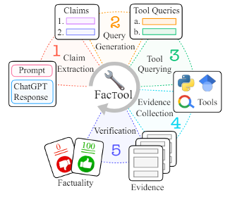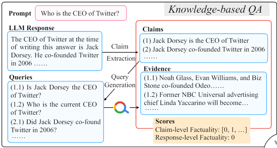• FacTool:将语言模型输出的答案转化成问题,用搜索引擎查询,看能否找到对应的依据