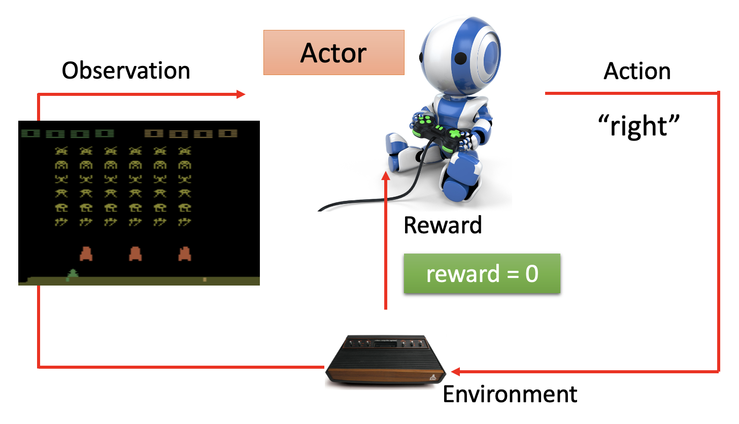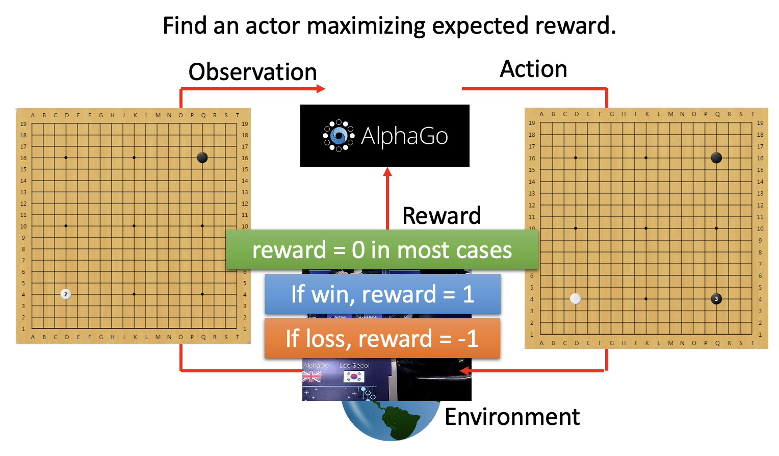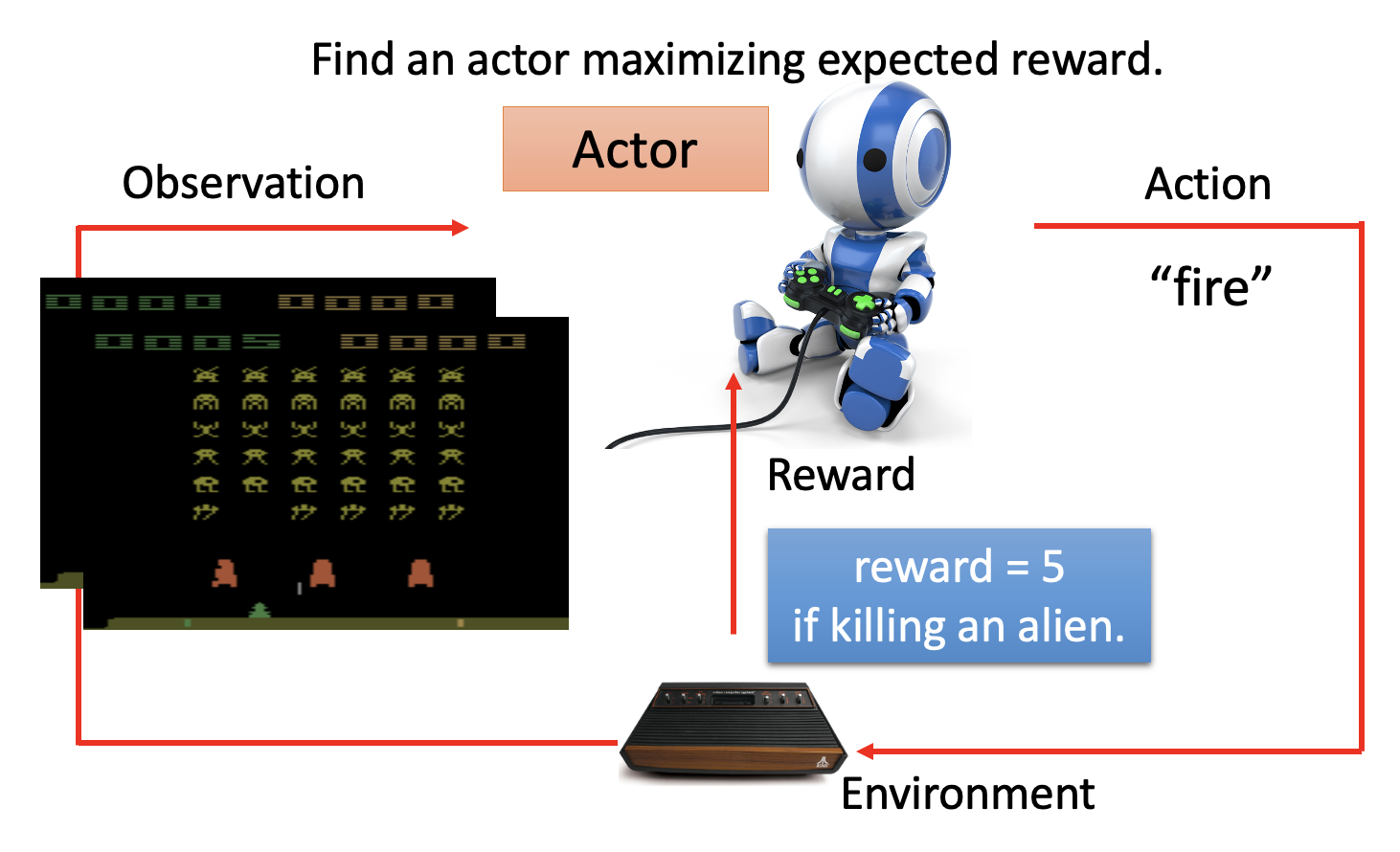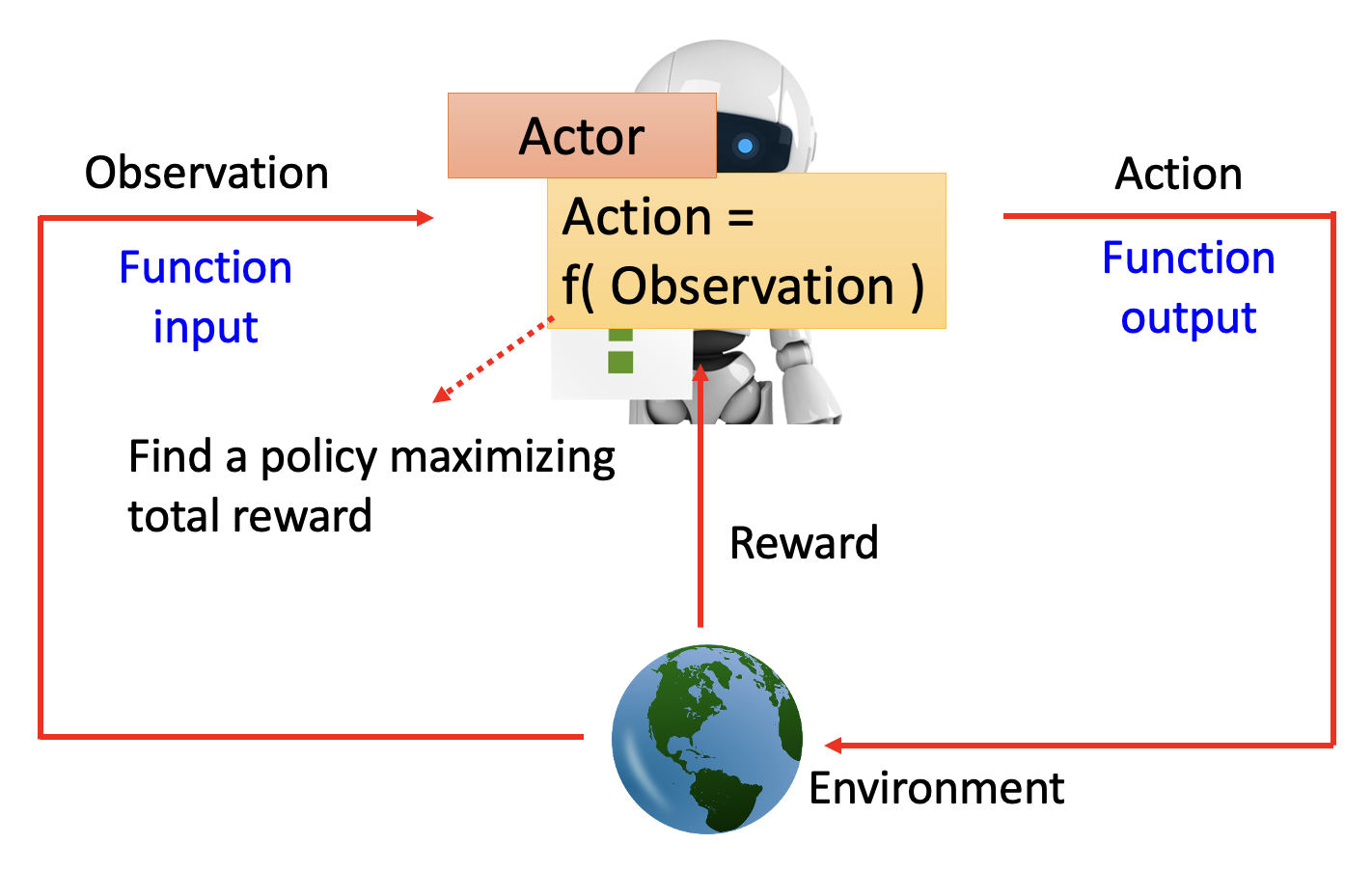 最开始的时候,我们认识到机器学习的目标近似于找一个函数;身为机器学习的成员之一,强化学习的目标亦是如此。整个强化学习的过程中有两个对象:行动者(actor) 和环境(environment)。它们之间的关系是: