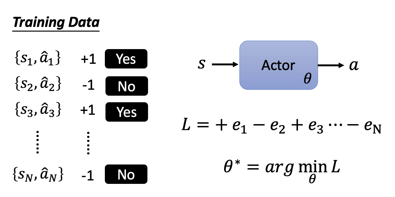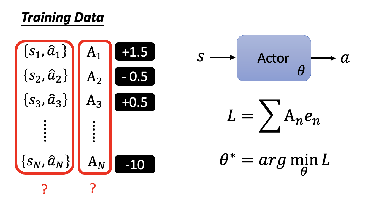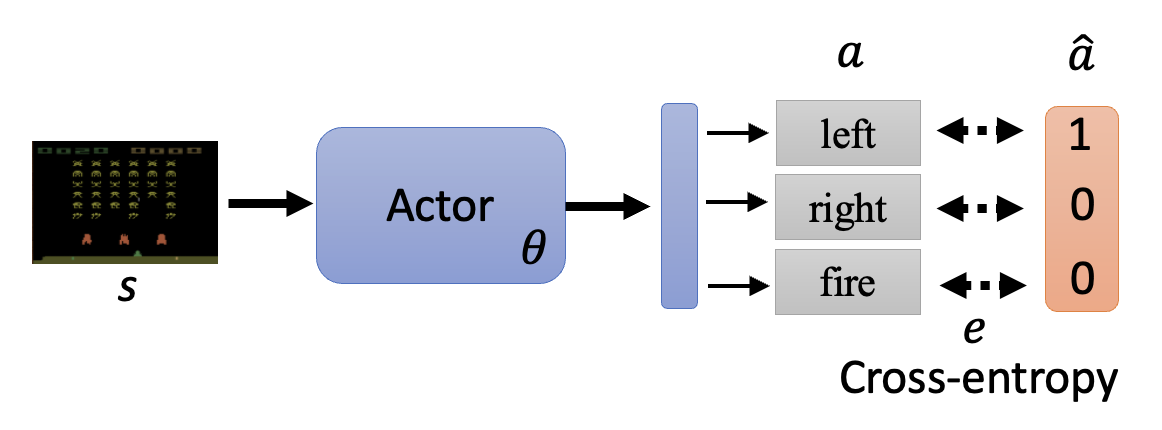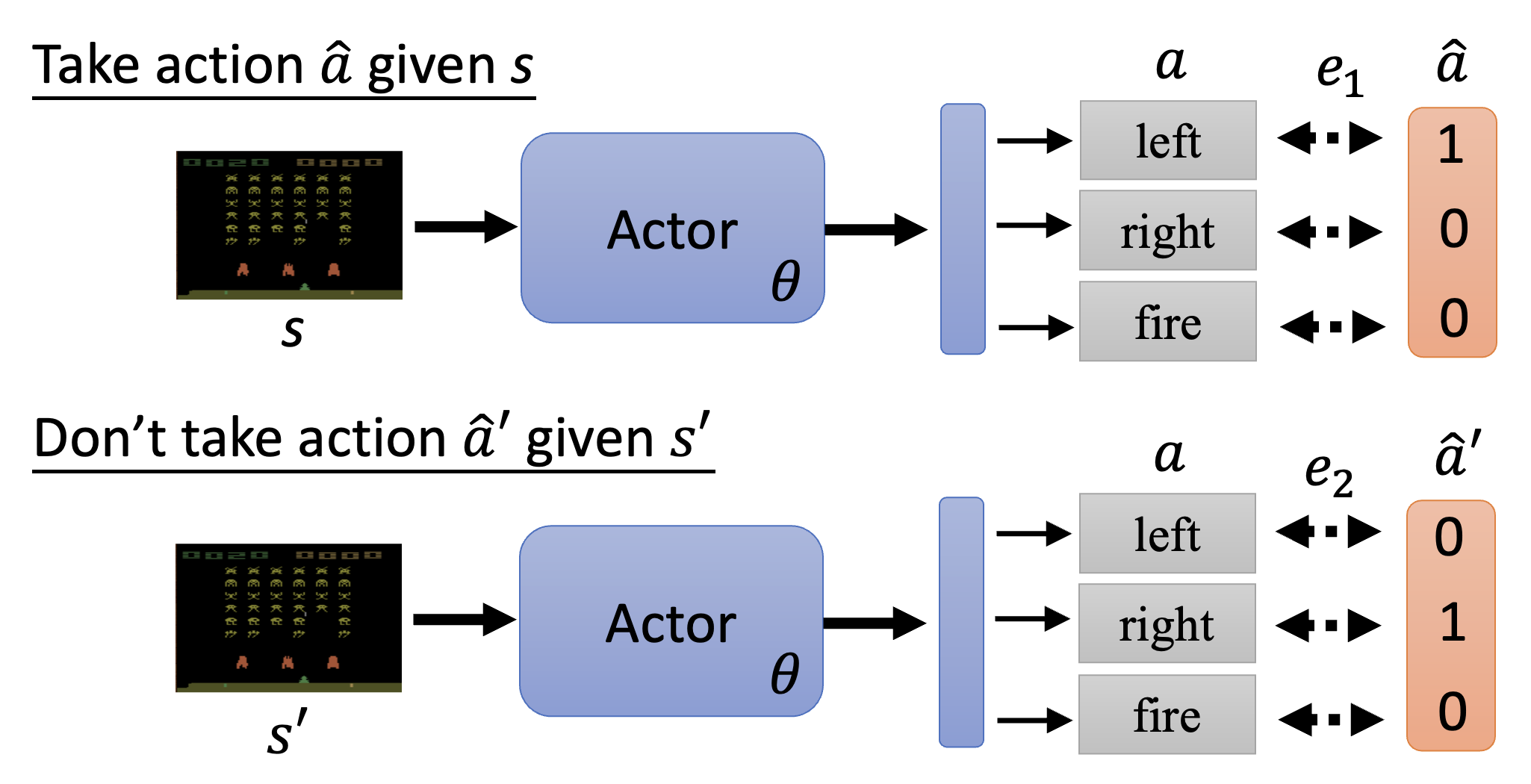 下面举个简单的例子:假如对于观察 \(s\),我们希望行动者采取行动 \(\hat{a}\);而对于观察 \(s'\),我们不希望行动者采取行动 \(\hat{a}'\)。那么对应的损失函数就是 \(L = e_1 - e_2\)。