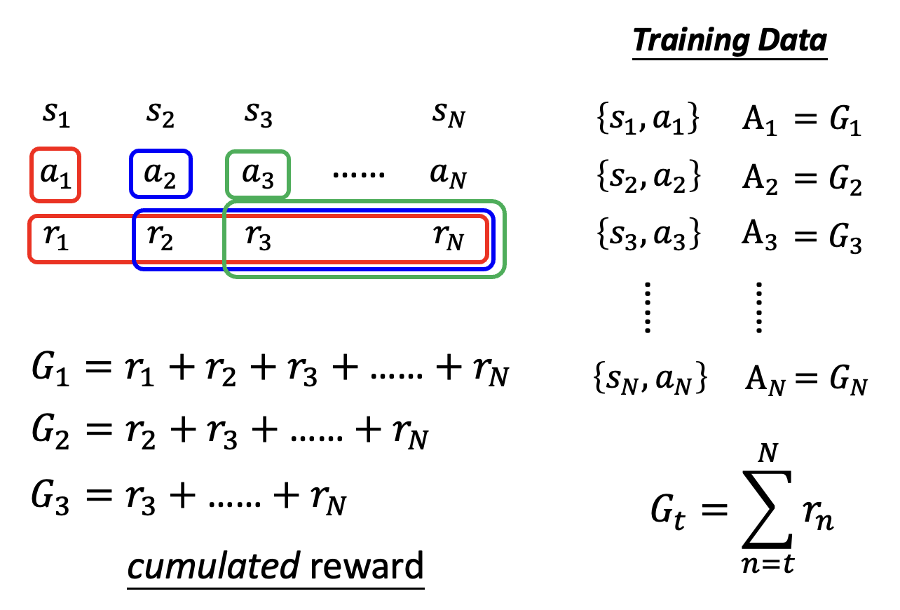 既然当前行动会影响到后续行动,那么它对应的系数 \(A_t\) 除了看自己的奖励外,还要看之后行动的奖励。所以令 \(A_t = G_t = \sum\limits_{n=t}^T r_n\),其中 \(G_t\) 称为累积奖励(cumulated reward)。