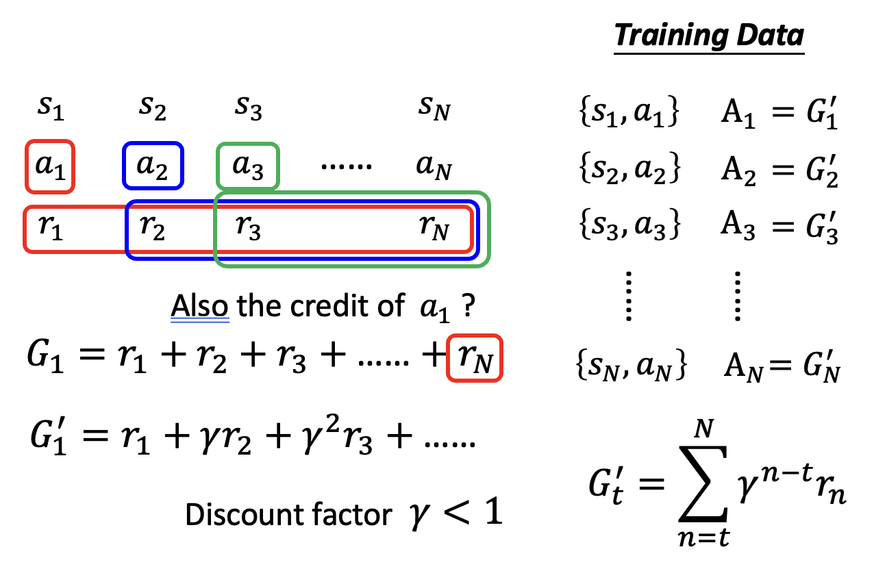 但上述方法有一个问题:当前行动的影响范围有限,可能对很后面的行动影响不是很大。改进办法是增加一个折扣因子(discount factor) \(\gamma < 1\),此时系数 \(A_t = G_t' = \sum\limits_{n=t}^N \gamma^{n-t} r_n\)。这样当 \(n-t\) 很大时,\(\gamma^{n-t}\) 的值就接近于 0,第 \(n\) 次行动对系数的计算影响就很小了。