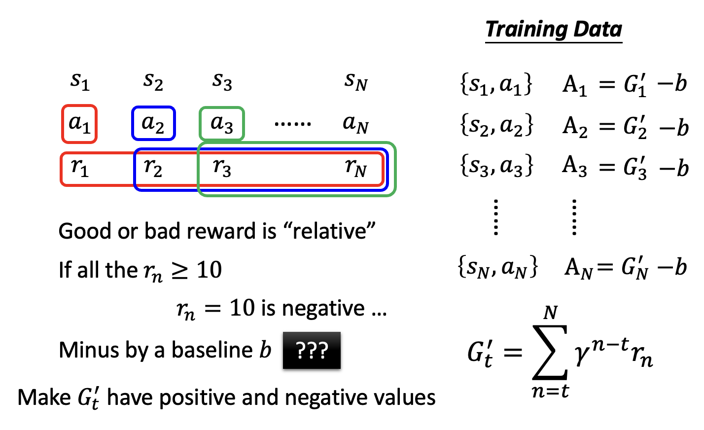 一个事实是:奖励的好坏是相对的。比如今天一张满分 100 分的考卷,小明考了 70 分。如果大家都是八九十分的话,那么小明考的不太理想;如果大家都是勉强及格的话,那么小明考的还算不错。为了让系数的大小更有区分度,在算出累积奖励 \(G_t'\) 后还要再减去一个基线(baseline) \(b\),使得 \(G_t'\) 的值有正有负。这里的难点是如何寻找一个合适的基线。