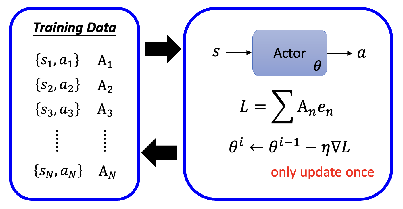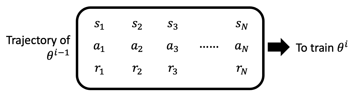 上述 RL 框架中,用于训练的行动者和用于和环境交互的行动者是相同的,我们称这种情况为在线策略(on-policy)。对应地,离线策略(off-policy) 就是两者不相同的情况。离线策略在这里不会细讲,不过值得一提的是这种方法的好处是训练当前参数 \(\theta^i\) 可沿用上个参数 \(\theta^{i-1}\) 的数据集,这样就无需每次更新都要重新收集数据。