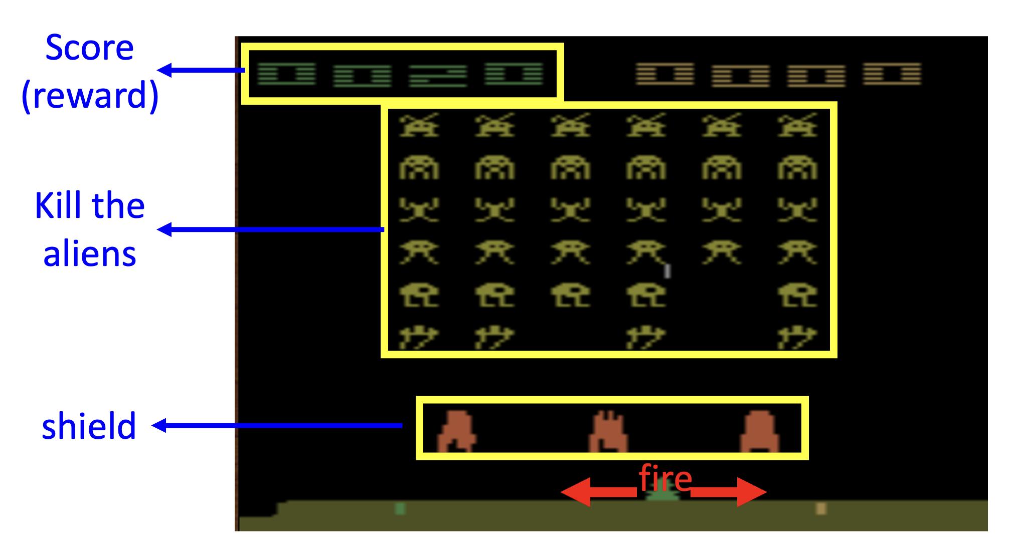 - 其次,除了行动者是可控的网络外,环境和奖励机制都是黑箱,而且都带有一定的随机性(在太空侵略者游戏中,我们不知道每次游戏出现什么画面)