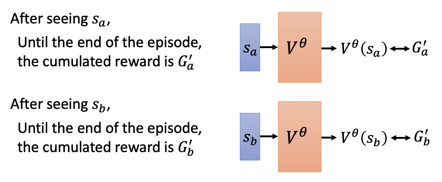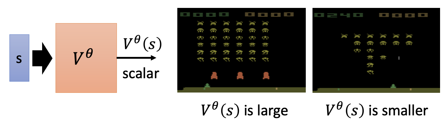 批评者要做的事是:对于给定的行动者 \(\theta\),根据当前的观察 \(s\)(有时还会考虑采取的行动 \(a\))来评判行动者的表现好坏。这个批评者的一般形式是一个值函数(value function) \(V^\theta(s)\),它的含义是:采用行动者 \(\theta\) 后,根据看到的 \(s\) 时预期得到的折扣累积奖励。注意到函数上标 \(\theta\),它意味着批评者的输出值取决于对行动者的评估。