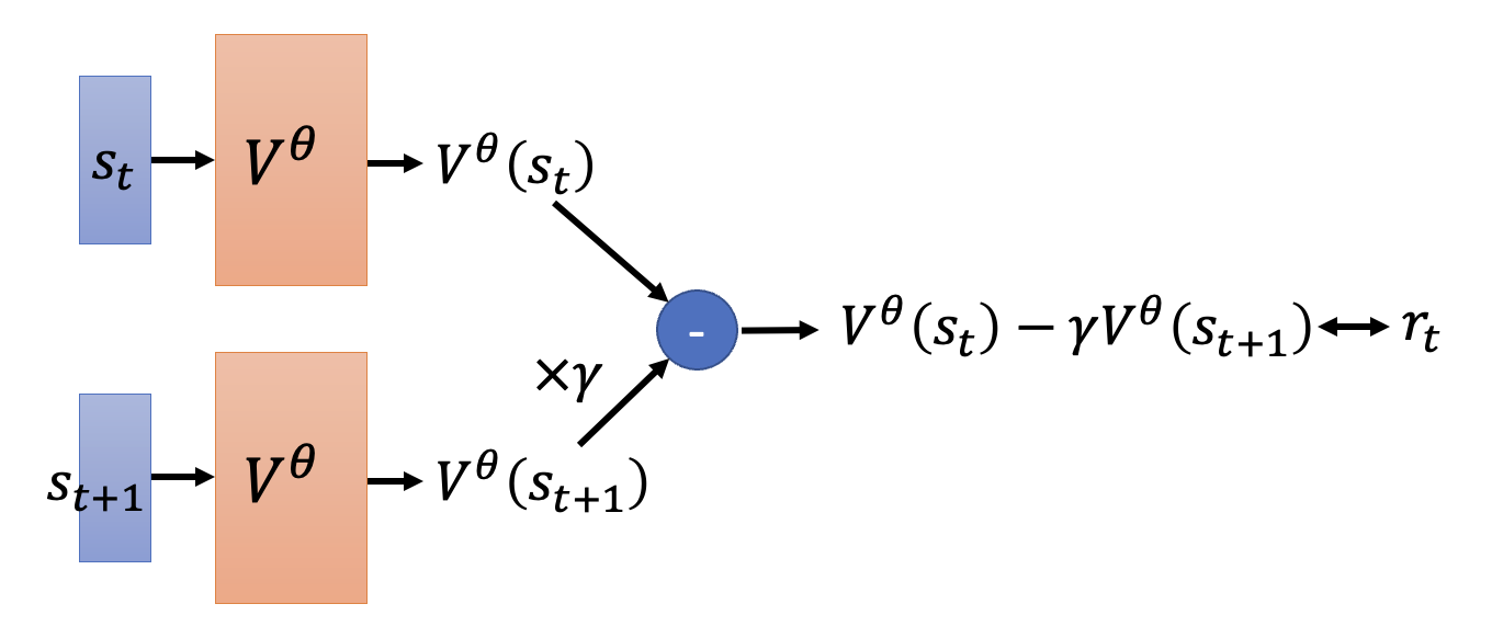 \[ \begin{align*} V^\theta (s_t) & = r_t + \gamma r_{t+1} + \gamma^2 r_{t+2} + \dots \\ V^\theta (s_{t+1}) & = r_{t+1} + \gamma r_{t+2} + \dots \end{align*} \]两式相减,得到 \(V^\theta (s_t) = \gamma V^\theta (s_{t+1}) + r_t\),或者 \(r_t= \gamma V^\theta (s_{t+1}) - V^\theta (s_t)\)