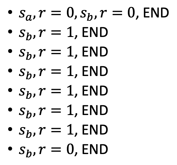 - 如果用蒙特卡罗法做,\(V^\theta (s_a) = \dfrac{0}{1} = 0\)