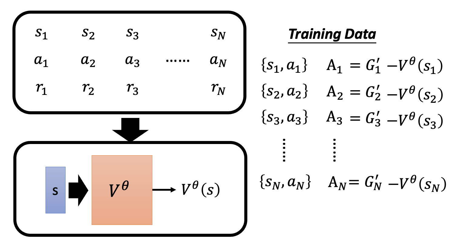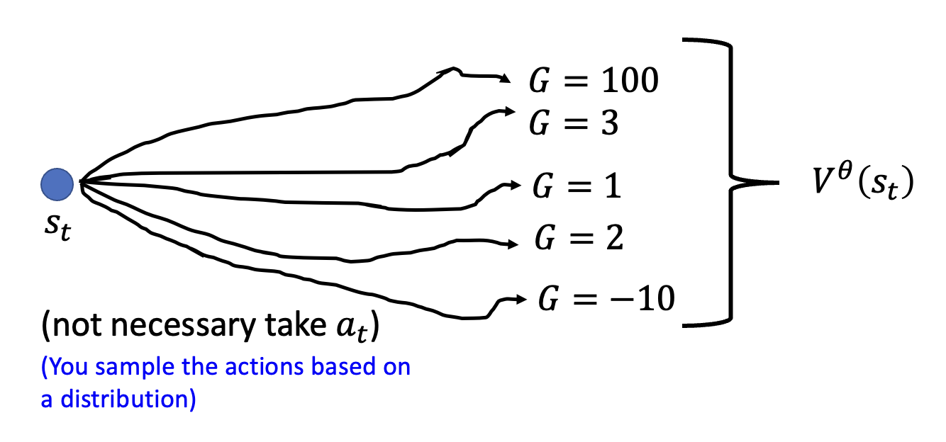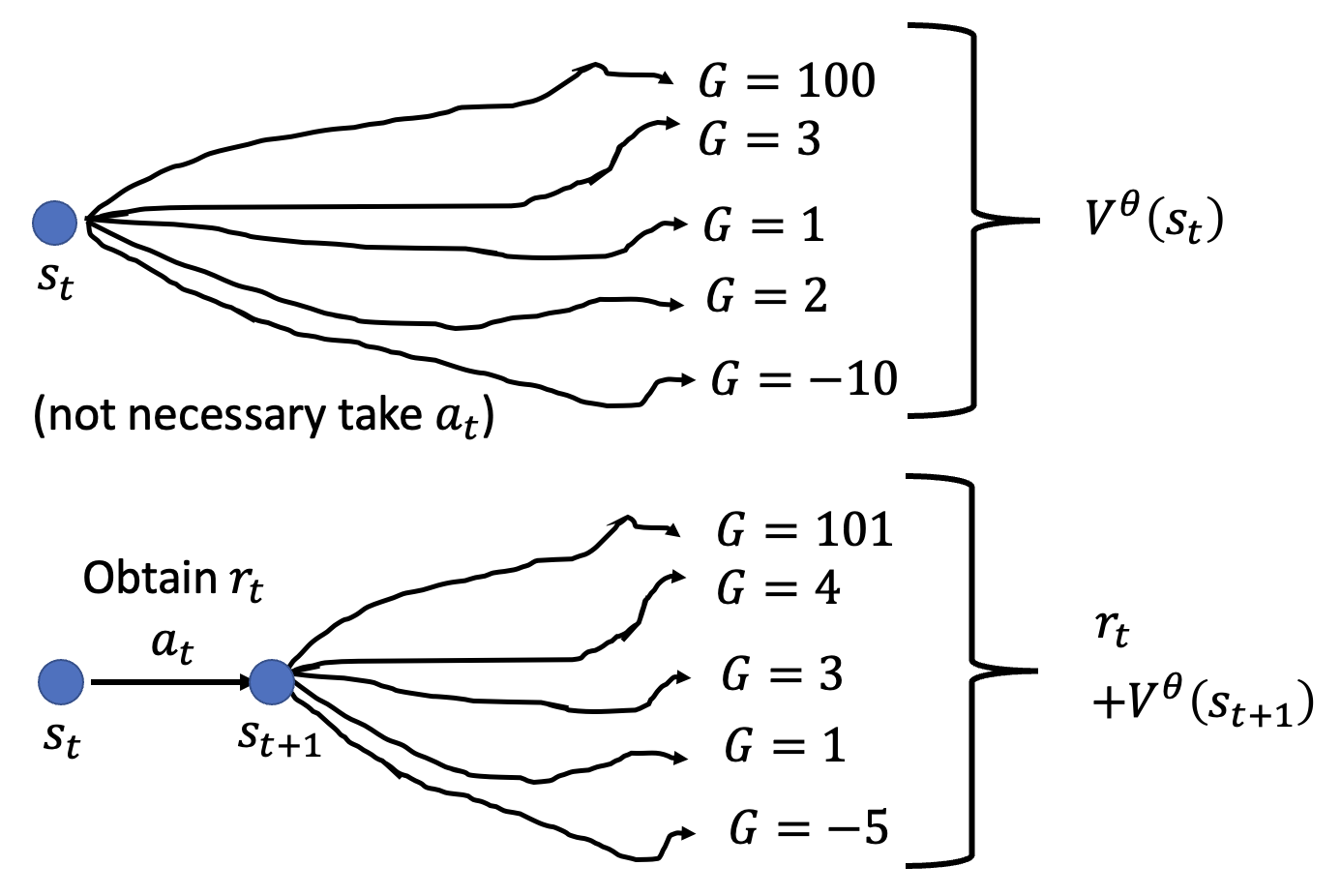 基于上述分析,计算 \(G_t'\) 时可参考 \(V^\theta (s_t)\) 的计算,考虑多种行动可能(实际上也确实用到了值函数的值