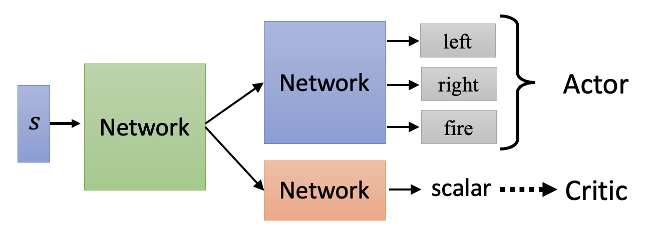 - 否则的话,以太空侵略者游戏为例,飞船(行动者)就会一直开火(因为只有开火才有正向奖励)而不移动,但这显然是不对的