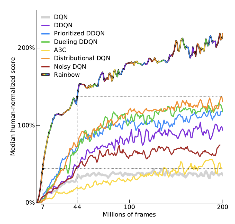 还有一种神奇的做法是只用批评者就知道要做什么行动,其中最知名的做法是深度 Q 网络 (deep Q network, DQN)。下图展示了 DQN 及其各种变体的表现。