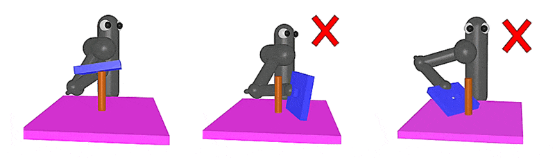 某个任务要求机械臂将蓝色的板子套在棍子上。如果奖励仅仅考虑让板子和棍子的距离越近越好,那么就会出现下面右边两张图的错误情况,这时无论机械臂怎么弄都没法成功。所以需要通过奖励塑造的技术设定合理的奖励,促使机械臂朝正确目标前进。