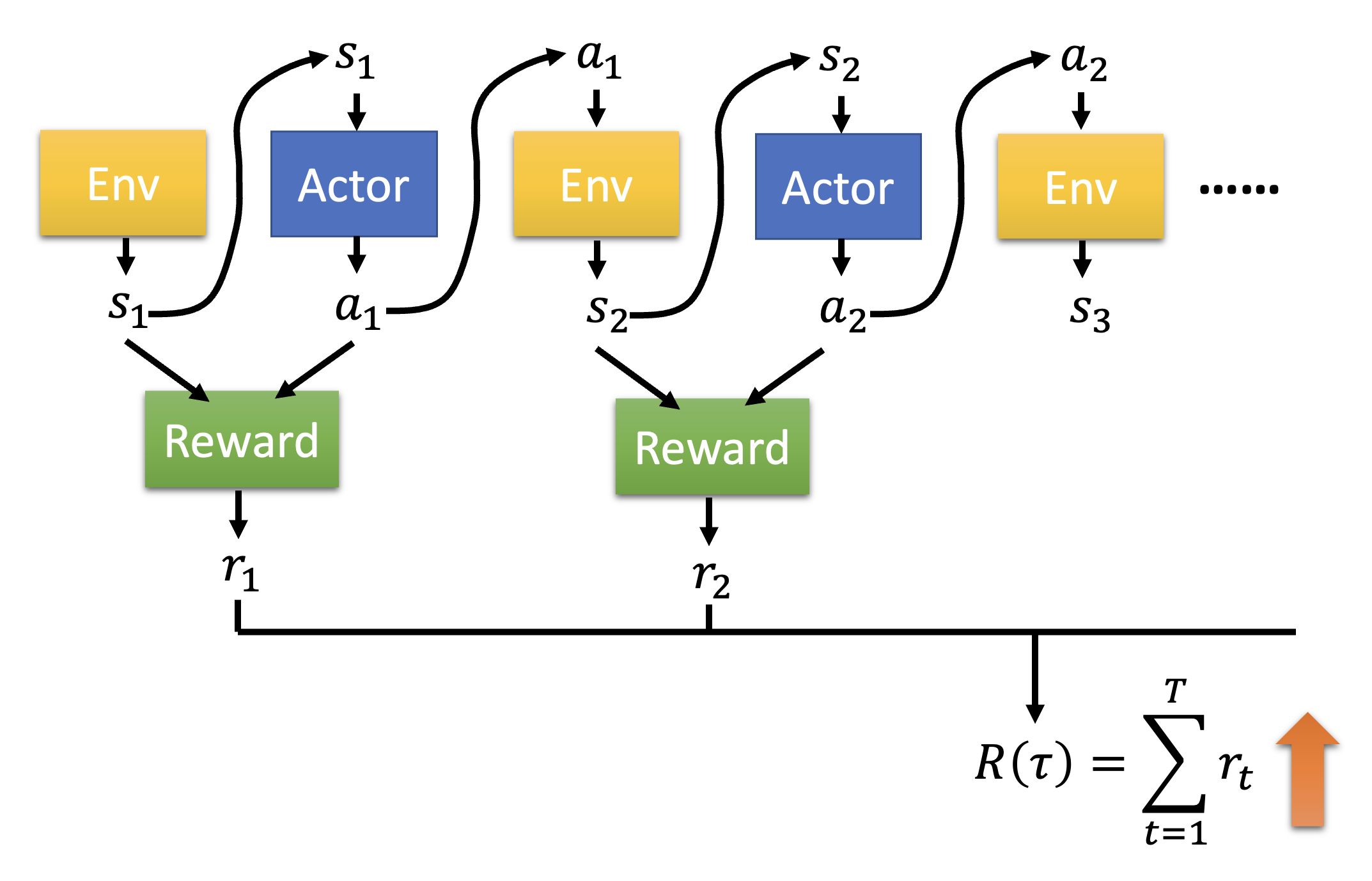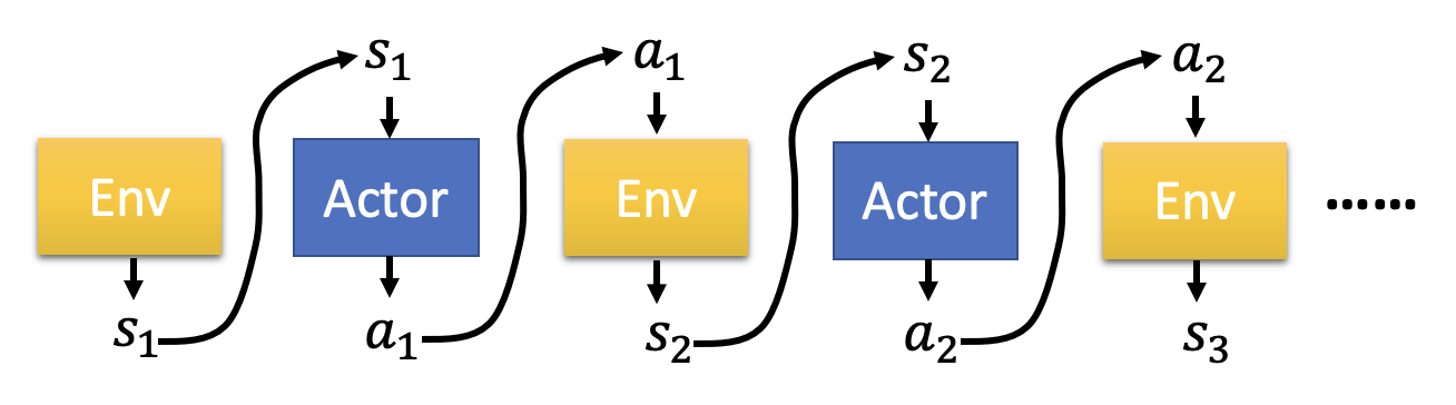 - 行动者会根据当前环境 \(s_i\) 采取行动 \(a_i\),使环境更新至 \(s_{i+1}\),对应的奖励为 \(r_i\)