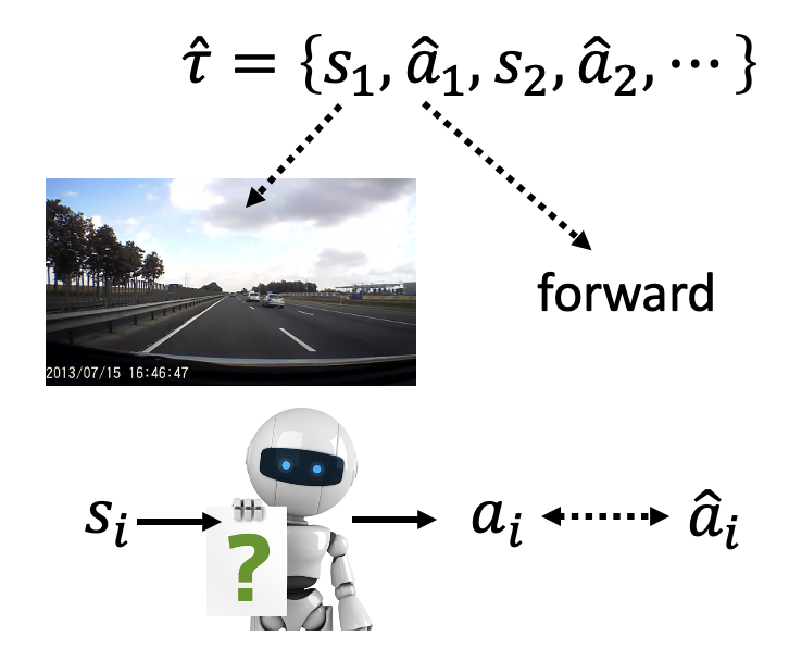 在模仿学习(imitation learning) 中,行动者仍然与环境互动,但是不去使用奖励函数,而是参考专家的演示(demonstration)——机器会根据一系列关于专家的轨迹 \(\{\hat{\tau}_1, \hat{\tau}_2, \dots, \hat{\tau}_K\}\) 来训练自己,从而达到“模仿”专家行为的效果。这种训练方法可用在无人驾驶、机器人等领域中。