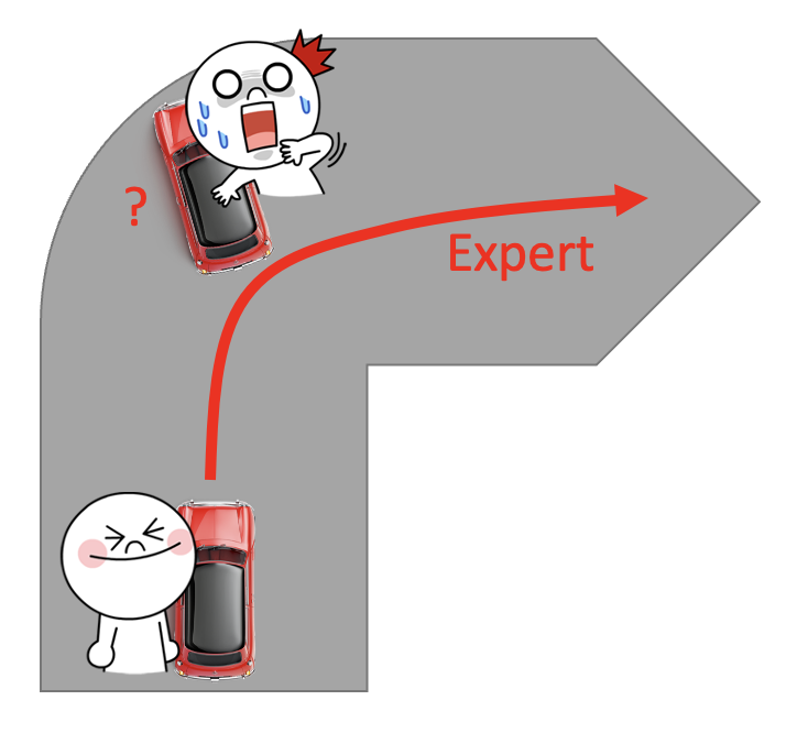 但这种训练方法有一个明显的问题:专家数据是不完整的,只是从所有情况中采样部分数据。比如在无人驾驶任务中,专家数据(一般)不会包含撞墙的数据(不要拿自己生命开玩笑