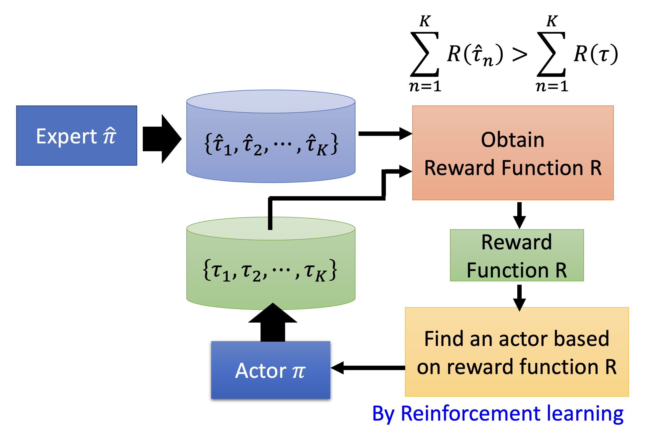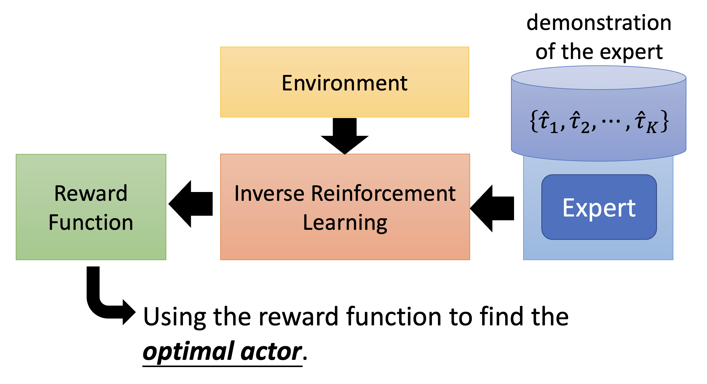 但是现在讨论的情况是没有奖励的,所以我们可以采用相反的顺序来训练模型:根据环境和专家演示来反推奖励应该是什么样子的,接着根据奖励函数来寻找最优的行动者。这便是逆强化学习(inverse reinforcement learning, IRL) 的大致流程。