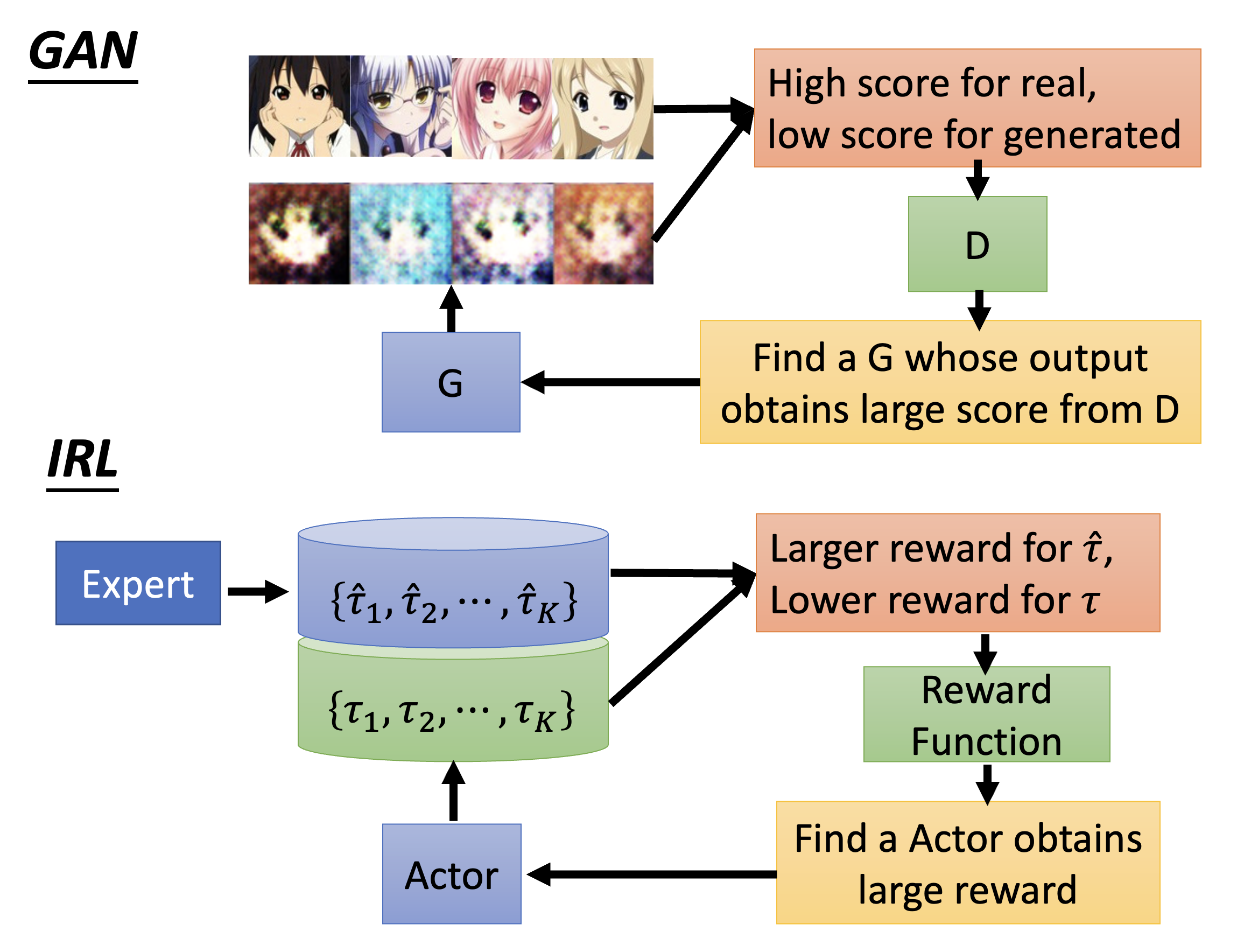 是不是感觉 IRL 和 GAN 很像?确实如此,我们可将行动者看作 GAN 的生成器,而把奖励函数看作 GAN 的判别器。可从下图直观感受 GAN 和 IRL 的共同之处:
