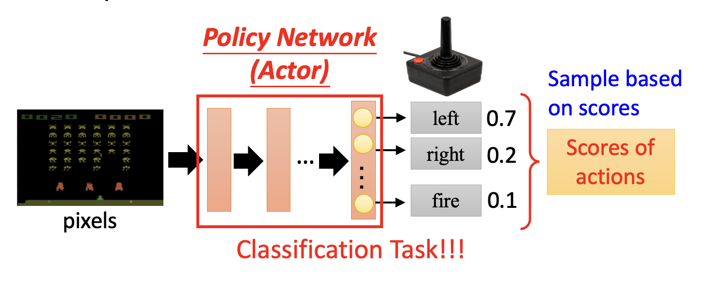- 行动者就是强化学习中的函数,里面也用到了神经网络结构,称为策略网络(policy network)