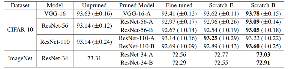 还有一篇研究质疑彩票假说,标题为 Rethinking the Value of Network Pruning。它发现从头开始训练一个小模型是 OK 的,甚至可以得到更棒的结果,如下表最后一列所示(用大模型的随机化初始参数来初始化小模型的