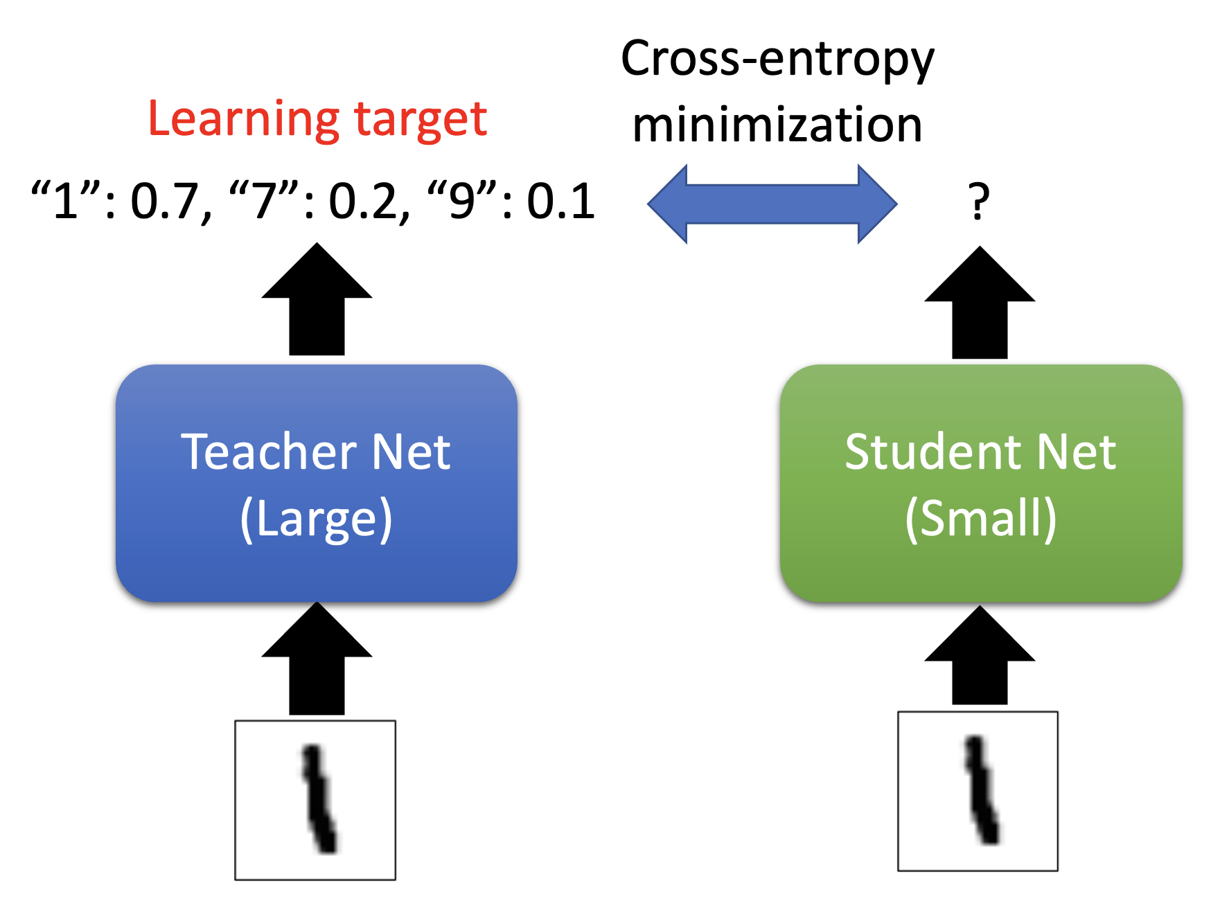 第二种方法叫做知识蒸馏(knowledge distillation),它的大致思路是:称大模型为老师,并称小模型为学生,让学生学习老师的训练成果,即让学生的输出和老师的输出(一个分布)之间的交叉熵最小化。无论老师的输出对错,学生照学不误。