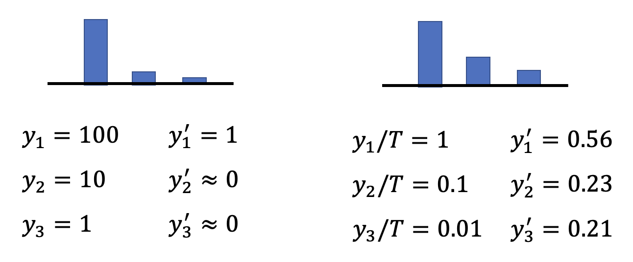知识蒸馏中会用到的一个小技巧是稍微修改一下 softmax 函数:将原来的计算公式 \(y_i' = \dfrac{\exp(y_i)}{\sum_j \exp(y_i)}\) 改为 \(y_i' = \dfrac{\exp(y_i / T)}{\sum_j \exp(y_i / T)}\)。引入 \(T\) 的意义是让原来比较集中的分布更加分散些,因为如果分布过于集中的话,学生学到的东西就和正确答案没什么不同了,但我们希望学生要学到老师的知识。