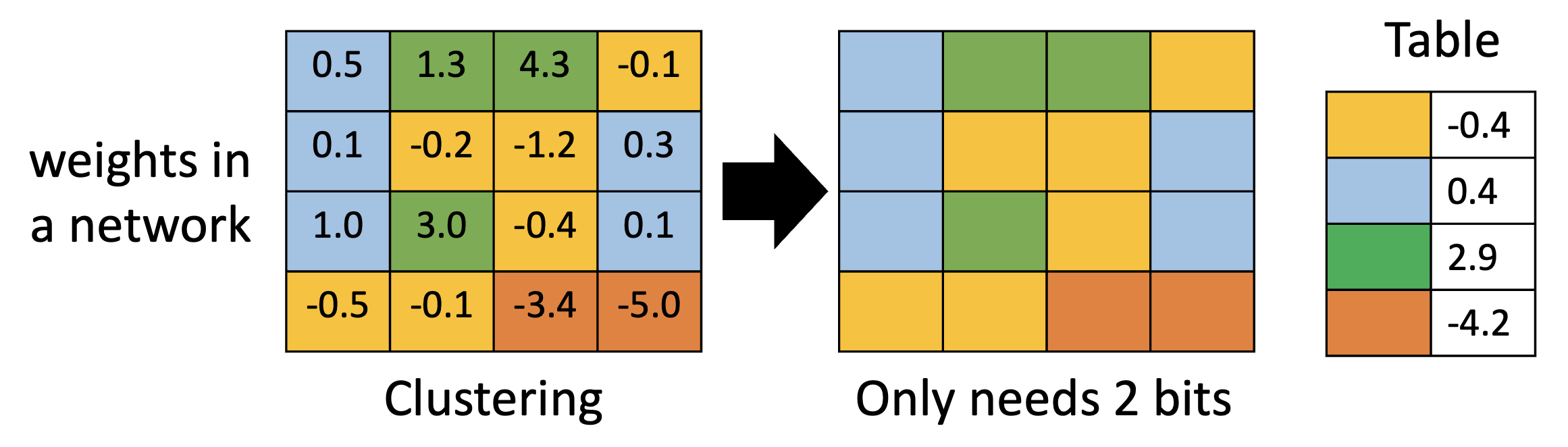 权重聚集(weight clustering):将网络中值相近的权重视为同一群权重,这群权重的值设为它们的平均值,这样就可以用更少的权重值表示整个网络的权重