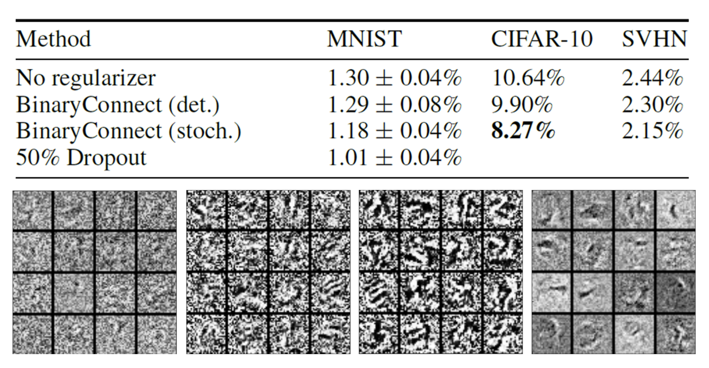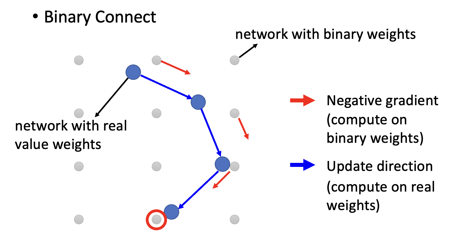 更激进的做法是只用一个位表示权重,即二进制权重(binary weight),权重只有 +1 和 -1。下面是一些和二进制权重相关的研究: