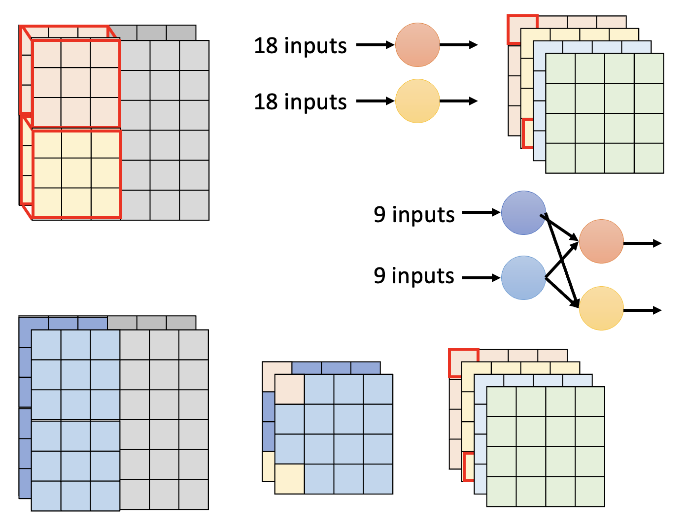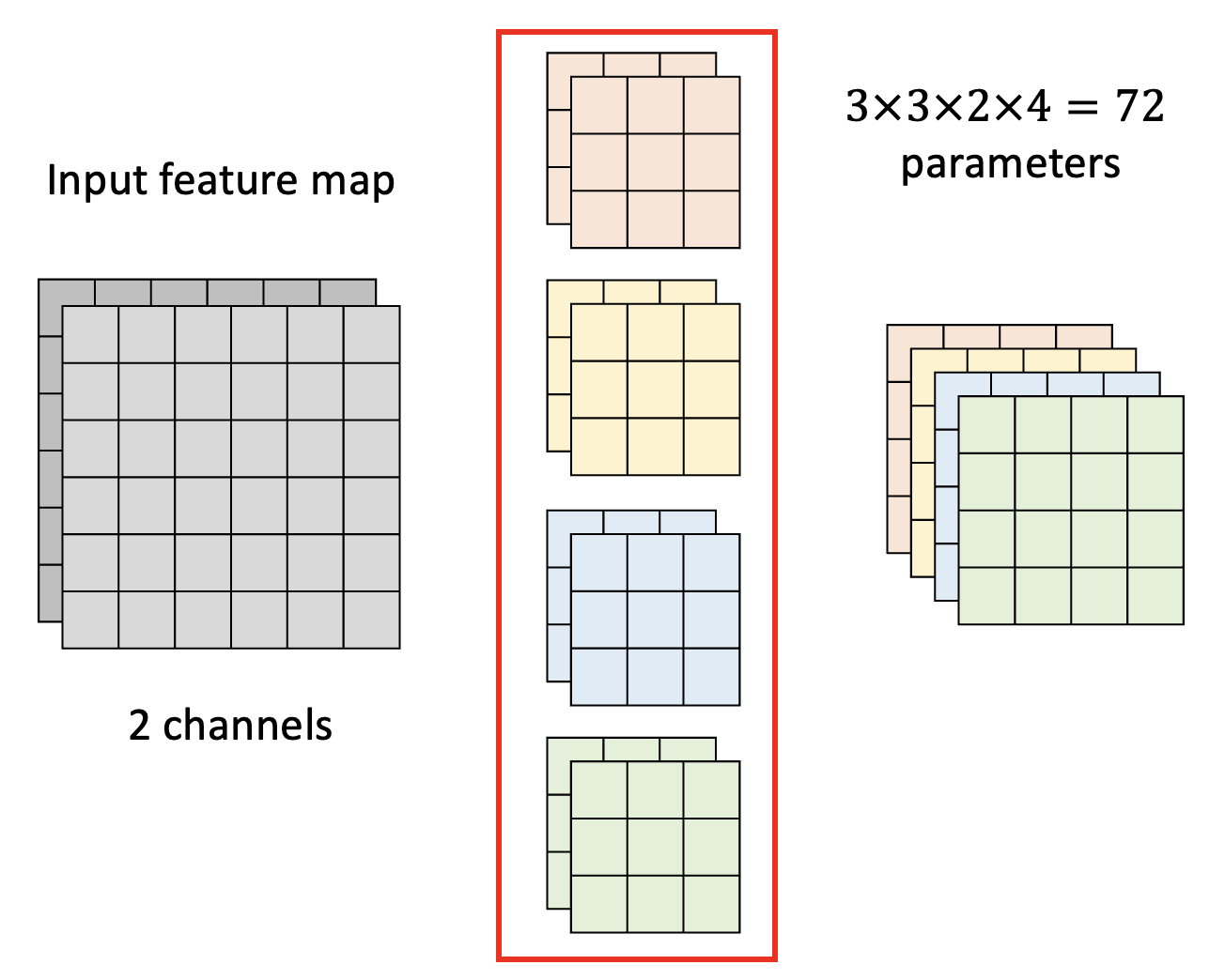 现在来比较标准 CNN 和深度可分离卷积用到的参数数量。令 \(I, O\) 分别为输入通道和输出通道的数量,\(k \times k\) 为滤波器的大小。