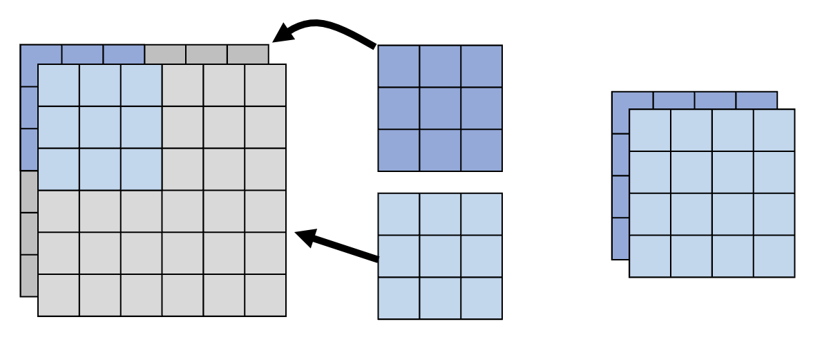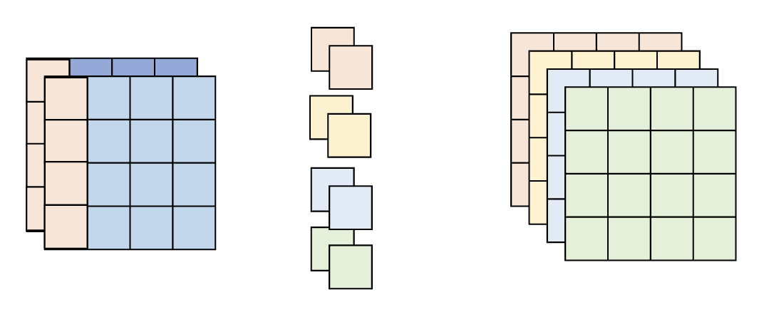 下面将以 CNN 为例考虑如何通过架构设计来压缩网络规模。先给出标准 CNN 的示意图(包括输入、滤波器和输出