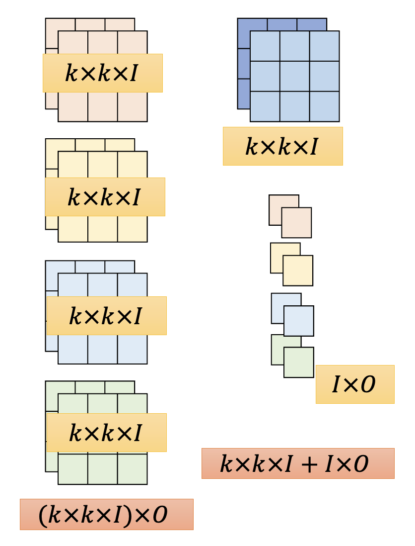 - 标准 CNN:\((k \times k \times I) \times O\)
