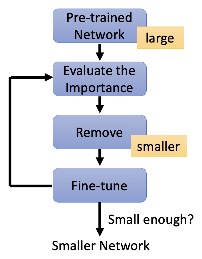 对于一个规模较大的预训练网络,评估其权重 / 神经元的重要性,然后去掉那些不重要的权重 / 神经元