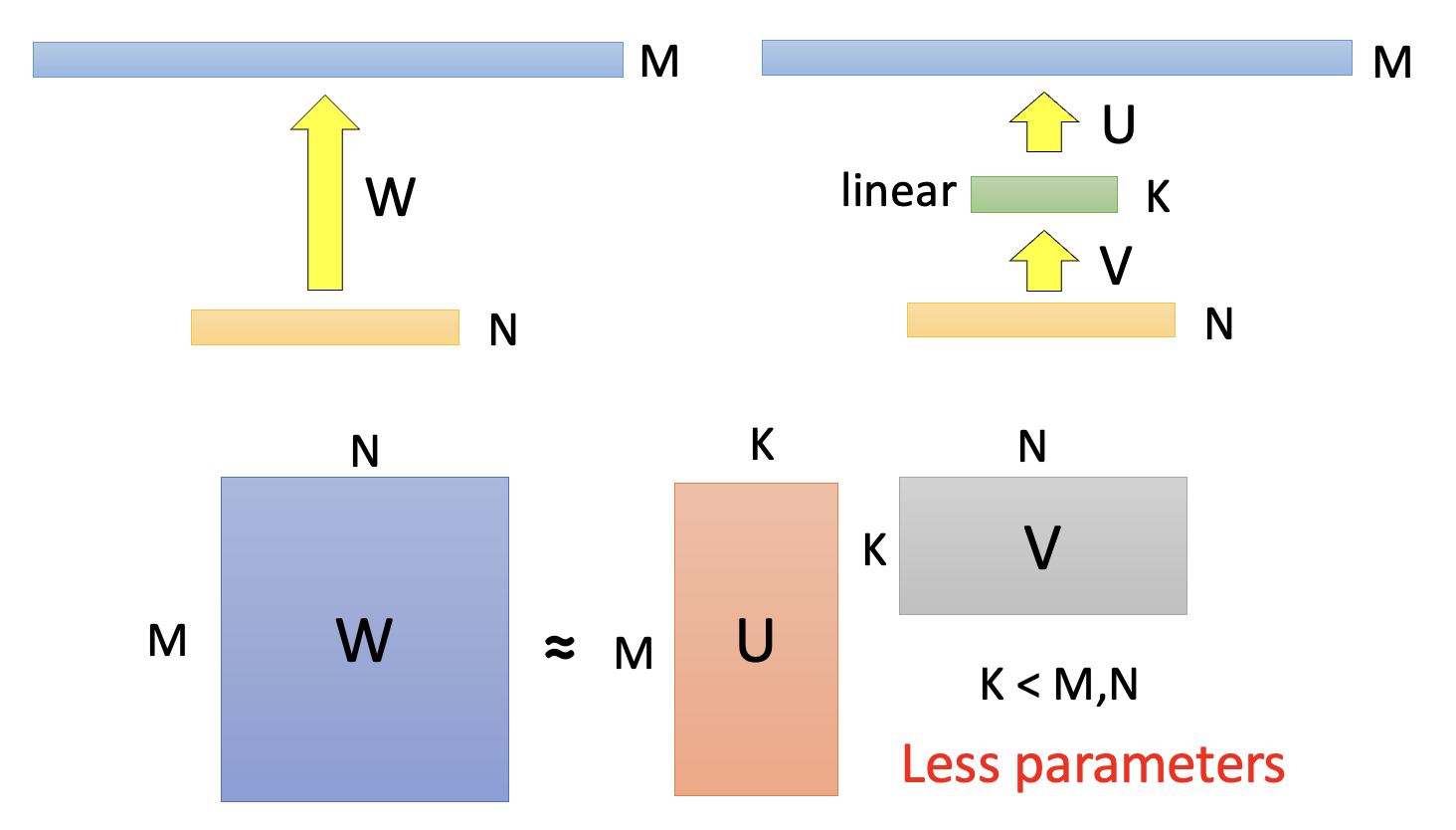 下面来解释这个技术的有效性。在深度可分离卷积出现前就有一种叫做低秩近似(low rank approximation) 的方法来减少网络参数。假如某一层有 \(N\) 个输入和 \(M\) 个输出,且 \(M > N\)(反过来也没问题,不过 PPT 是这样假设的