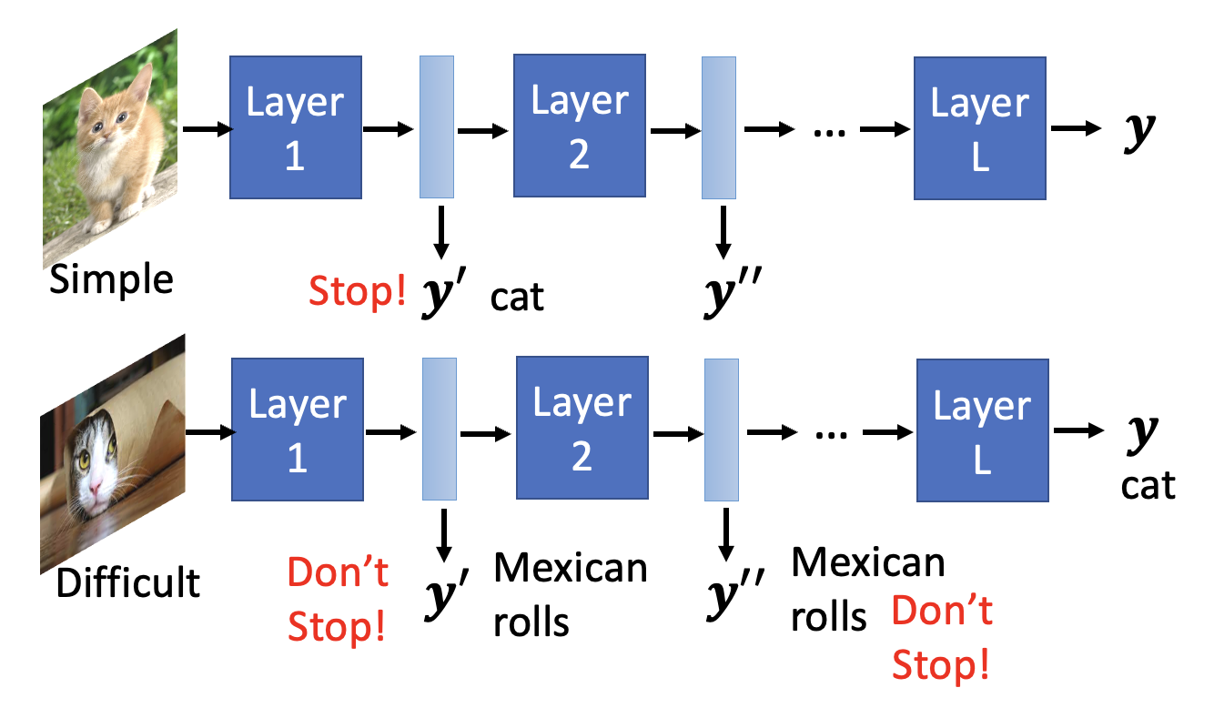 上述两种方法的一个共同点是宽度 / 深度的选择权还是在人类手中。对应地,存在由模型自己决定宽度 / 深度的方法,比如下面这种根据样例难度来计算的方法: