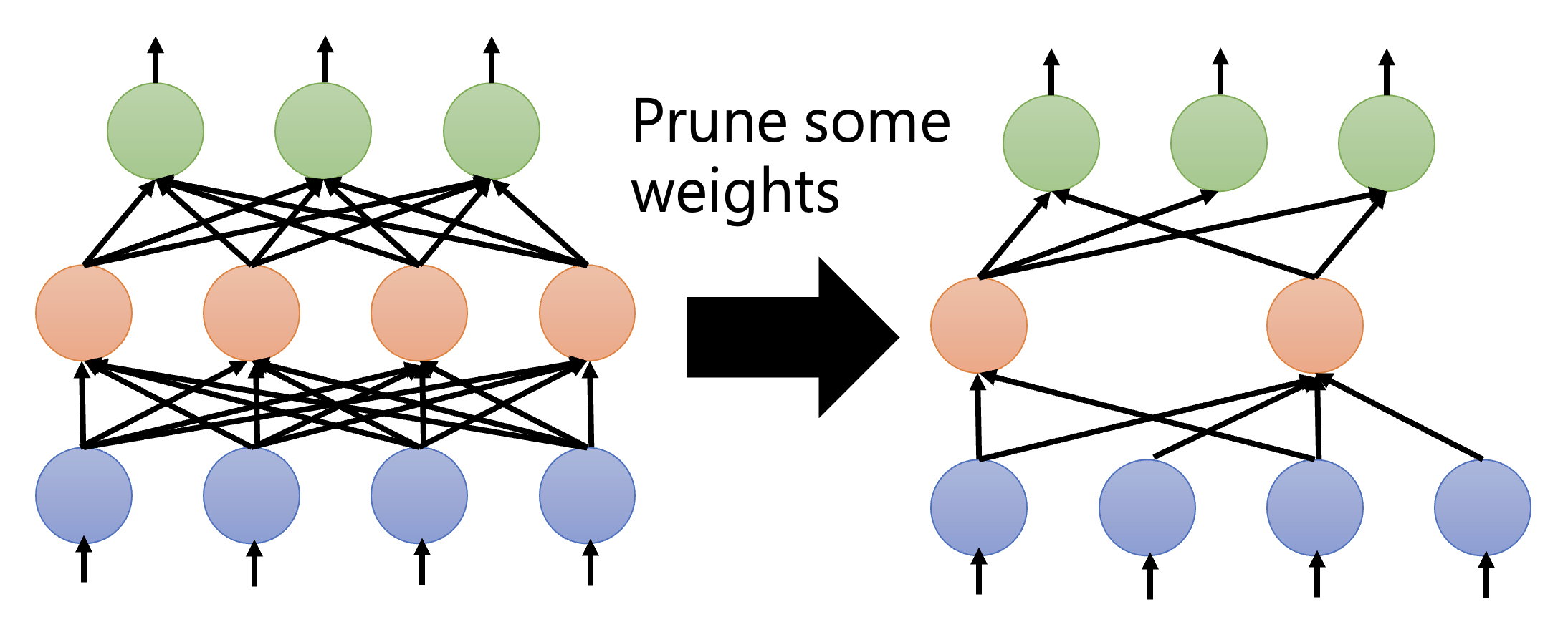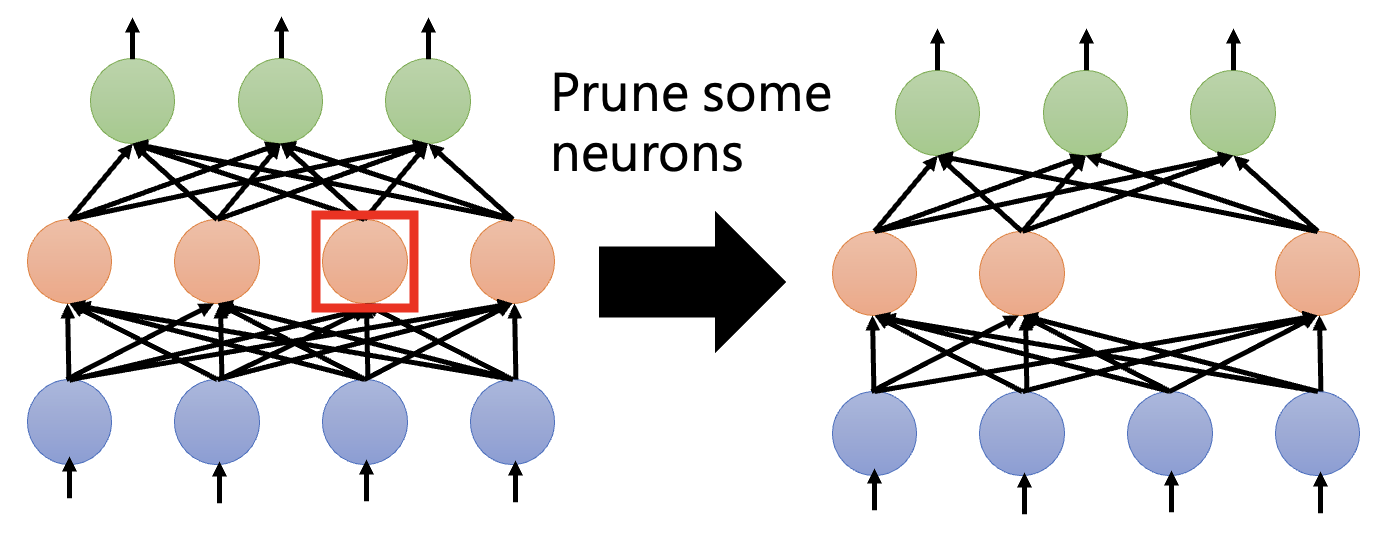第一种技术叫做网络剪枝(network pruning)。该技术的可行性来源于一个观察:网络存在过参数化(over-parameterized) 的问题,即网络上有大量权重或神经元的冗余,那么它们就可以被剪掉。