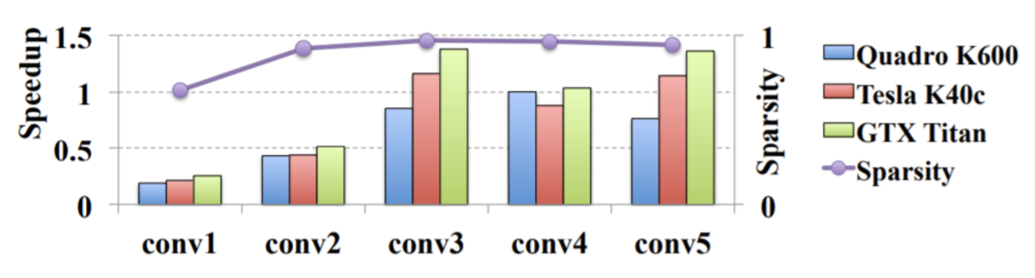 - 柱形图对应加速比大小,低于 1 的表示速度变得更慢,可见大多数模型在剪枝后速度反而变得更慢了