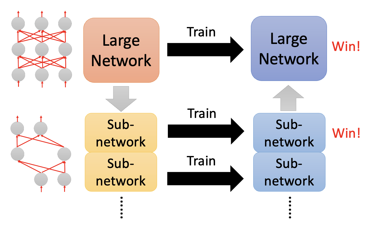也许读者会问:既然我们能让一个大模型变成小模型还能保持差不多的精度,那么为什么不直接训练一个小模型,这样不是更省力吗?但是研究表明,直接训练一个小模型相比大模型更难训练成功,反过来说就是大模型更容易被优化。而这个“研究”给出的结论叫做彩票假说(lottery ticket hypothesis),它的大致思想是:我们可以把一个大模型看作多个堆叠起来的小模型,那么训练一个大模型就相当于训练多个小模型。一个小模型相当于一张彩票(共同点就是都很玄学 (bushi)