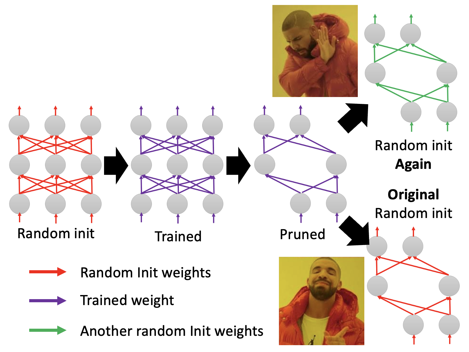 上面只是用一个浅显的比喻来简单认识了一下,接下来将从实验角度来说明这一假说的合理性。先对一个大模型的参数进行随机的初始化,然后通过不断训练得到更新后的模型,接着对该模型进行剪枝,得到一个小模型。神奇的地方在于,如果对小模型的参数进行随机初始化,那么这个小模型就训练不起来;但如果让小模型沿用一开始大模型用的随机参数初始化,那么模型就能训练起来。
