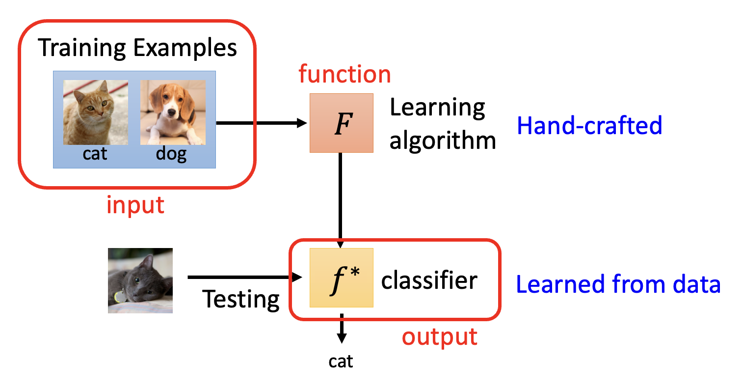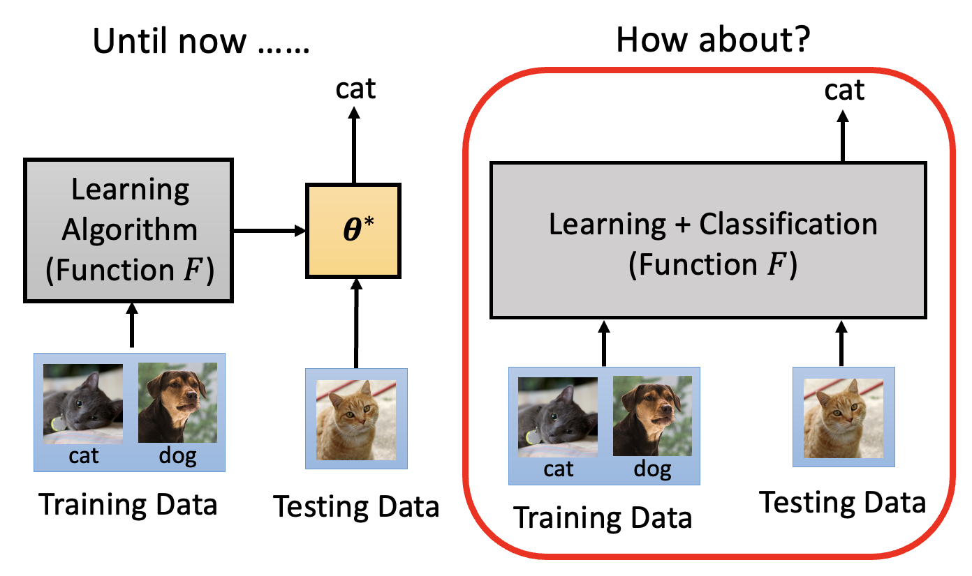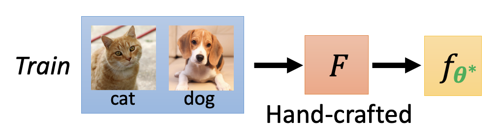 元学习的核心部分是一个学习算法(learning algorithm),它是一个人为设定的,可以学习的函数,记作 \(F\)。它将整个数据集作为输入,输出一个分类器 \(f^*\)。测试的时候就将测试数据丢给分类器,期望分类器能做出正确的分类。