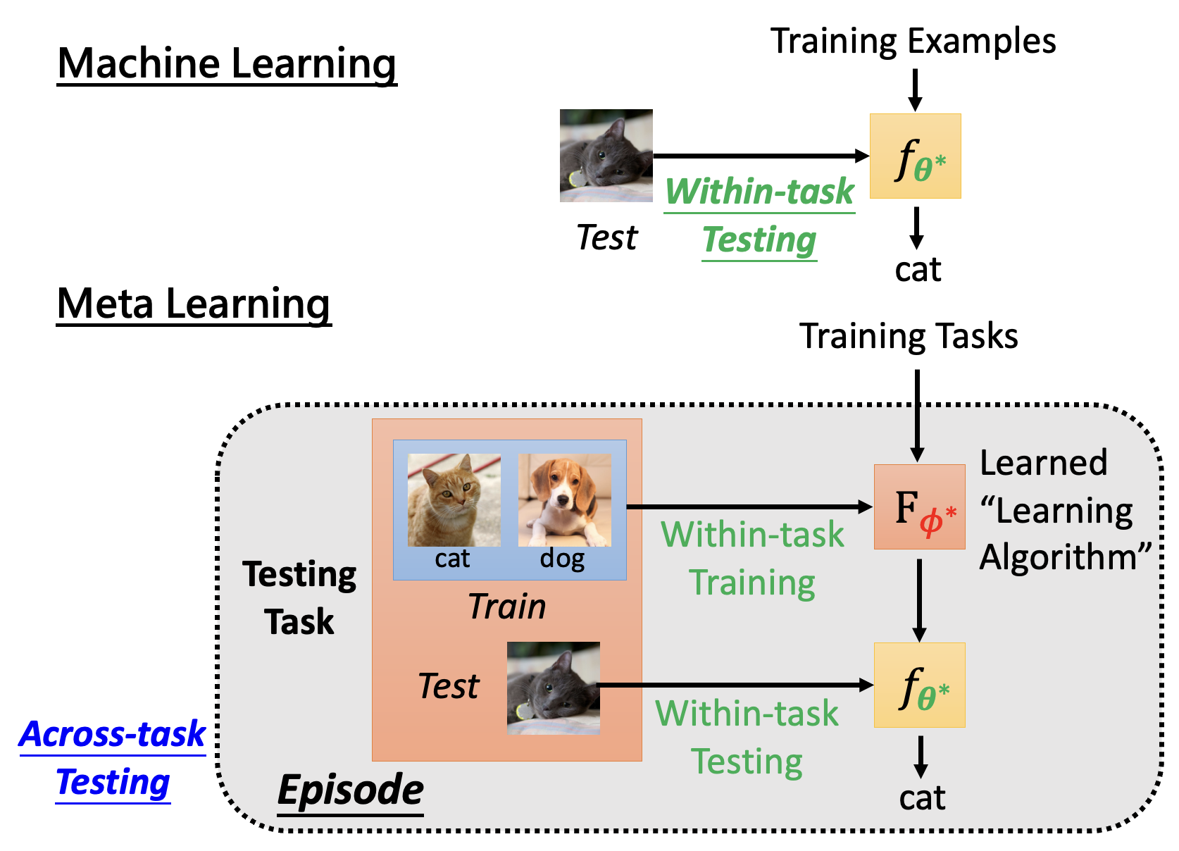 注意到一般的 ML 是在训练样例上计算损失,但是在元学习中,损失是基于测试样例算出来的——但不要搞错,这里的“测试样例”是来自训练任务的测试样例(对应地还有“测试任务”的概念