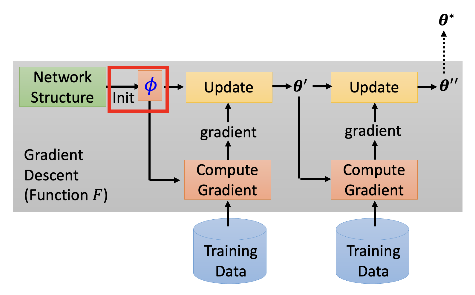 不过元学习有一个问题:以 MAML 为例,它在学习初始化参数 \(\varphi\) 时需要用到梯度下降法,而在梯度下降法前也需要初始化参数(记作 \(\varphi^0\)