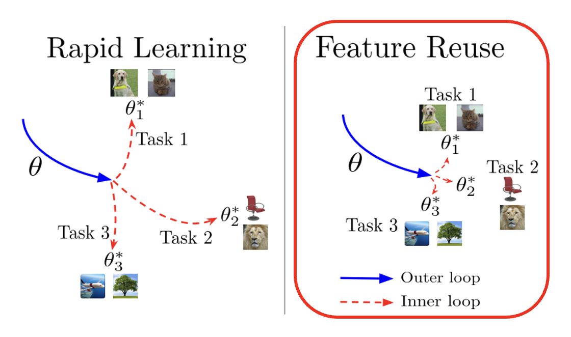 有一个叫做 ANIL(Almost No Inner Loop) 的研究指出,MAML 的表现之所以好,是因为 MAML 具有特征复用 (feature reuse) 的性质(右图