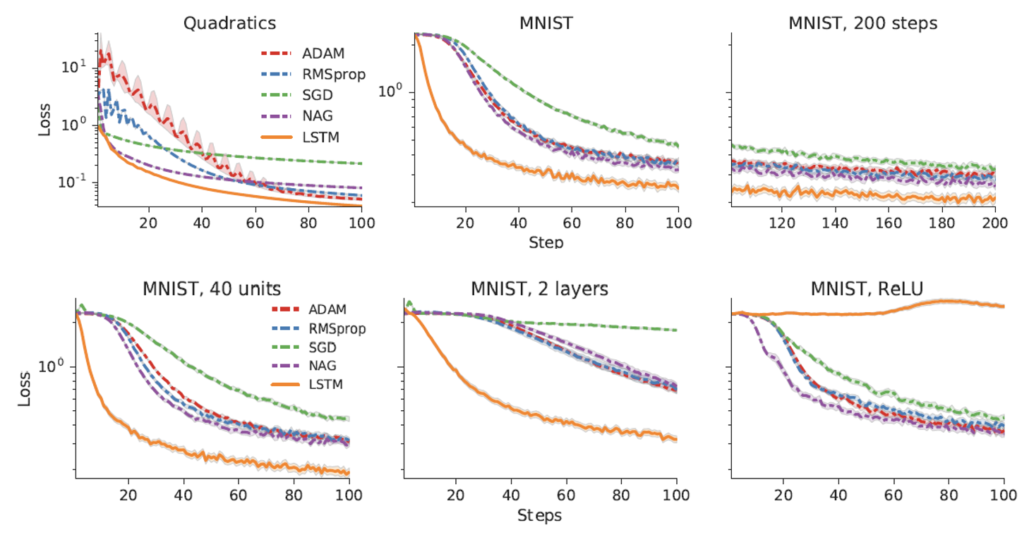 图中 LSTM 是元学习学出来的结果,可以看到在绝大多数情况下它由于其他的优化器。但如果将激活函数换成 ReLU(原来用的是 Sigmoid