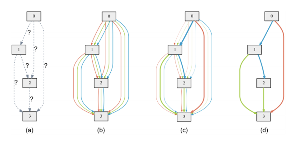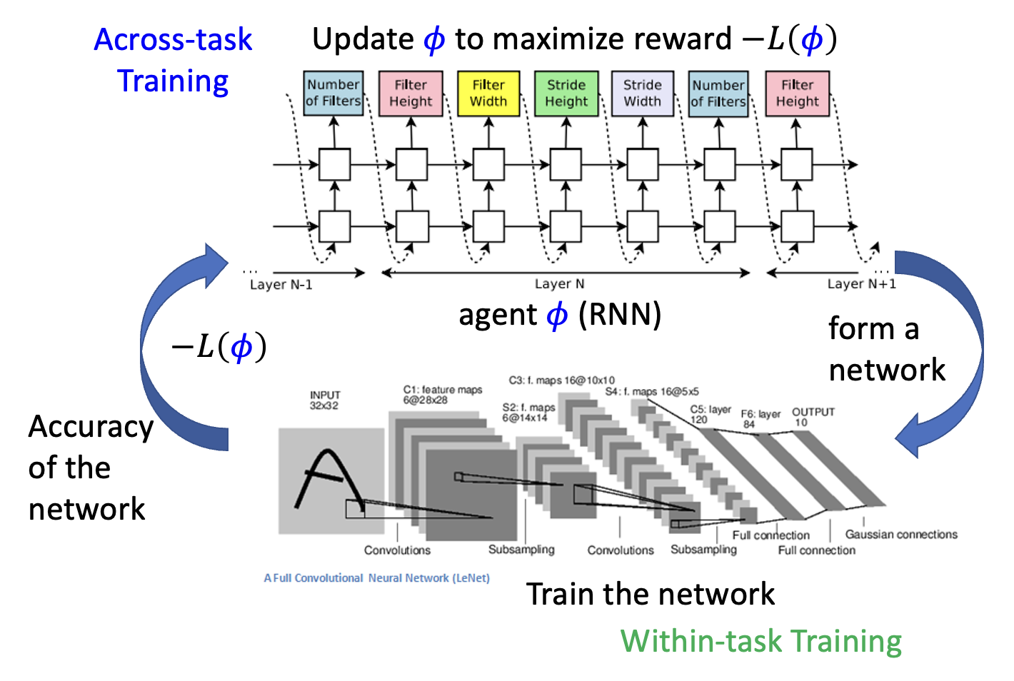 - 智能体采取一系列行动来决定网络架构,其中 \(\varphi\) 为智能体的参数,而 \(-L(\varphi)\) 为对应的奖励,训练的目标就是让它最大化