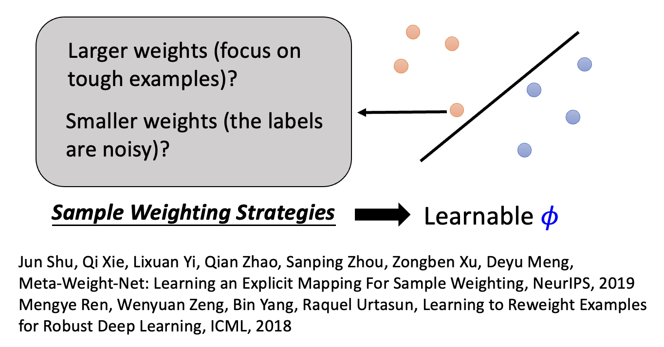 - 有时为不同的样本给予不同的权重,那么就要采取不同的样本权重策略,比如有些样例距离边界特别近,是比较难学的那类样例,那么就让对应的权重大一些;又或者认为这种靠近边界的样例是一种“噪音”,应当为其赋予较小的权重。