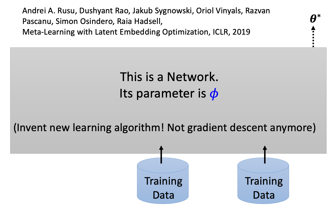 我们甚至可以把整个网络看成元学习的参数 \(\varphi\),也就是发明一个新的学习算法,而不采用梯度下降法。