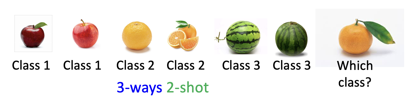 - N 路 K 样本分类(N-ways K-shot classification):每个任务中有 N 个类和 K 个样例
