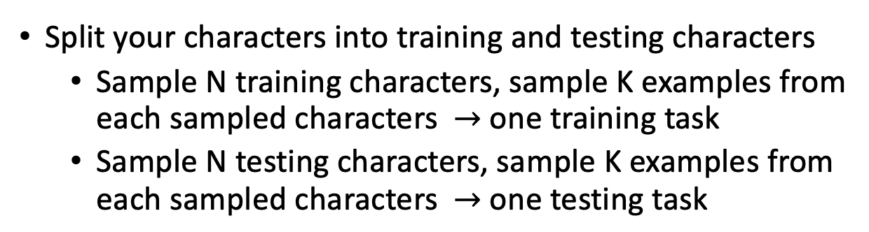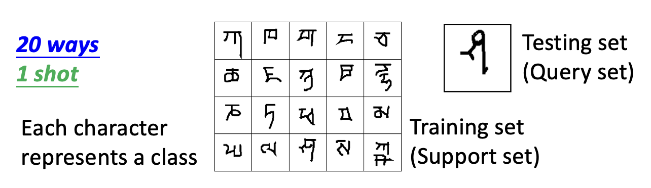 其中一个著名的例子是 Omniglot:包含 1623 个(奇异的)字符图像,每一类有 20 个样例。